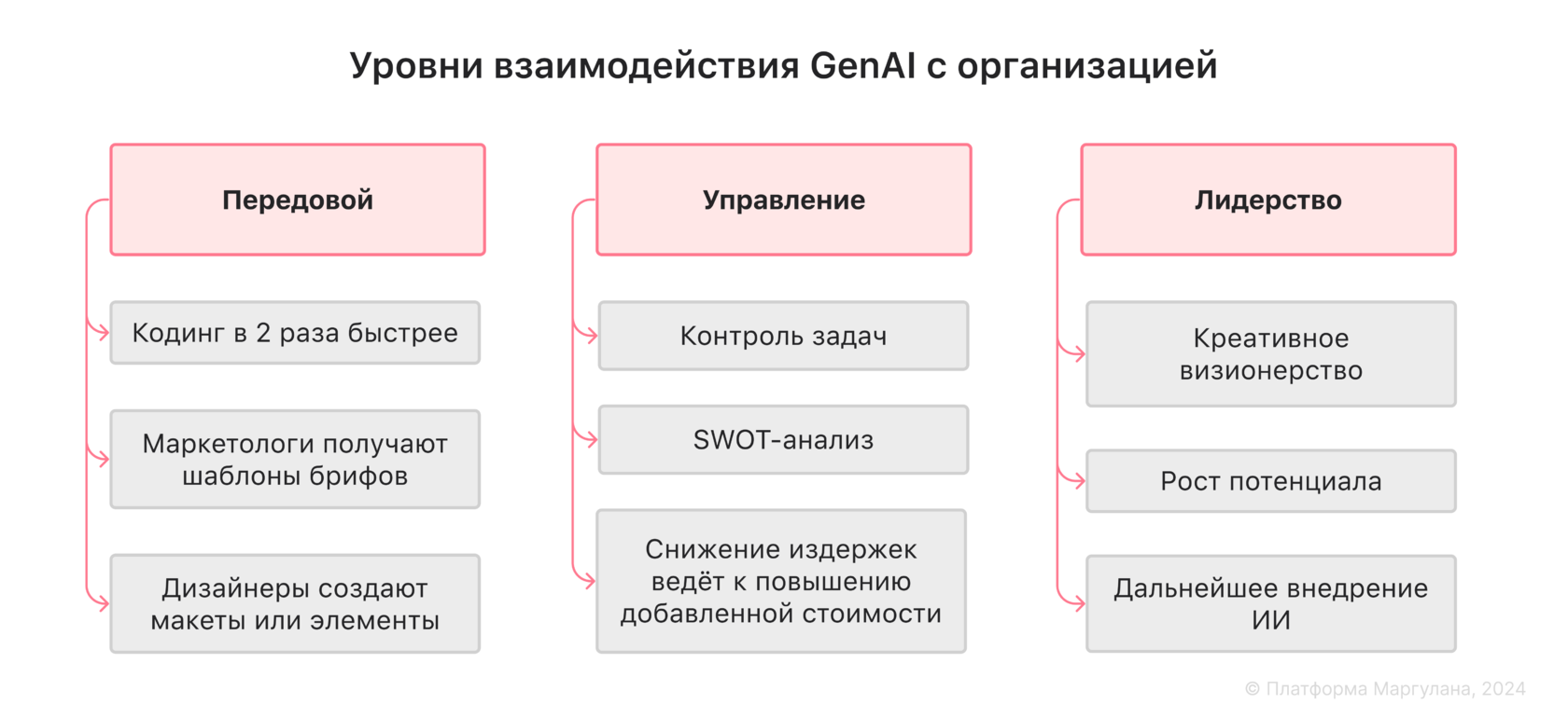 Таким образом, генеративный ИИ может принести пользу всем уровням организации, если будет ориентирован на обогащение рабочих процессов. Руководители, избегающие тренда замены, сохранят таланты и добьются приверженности.
